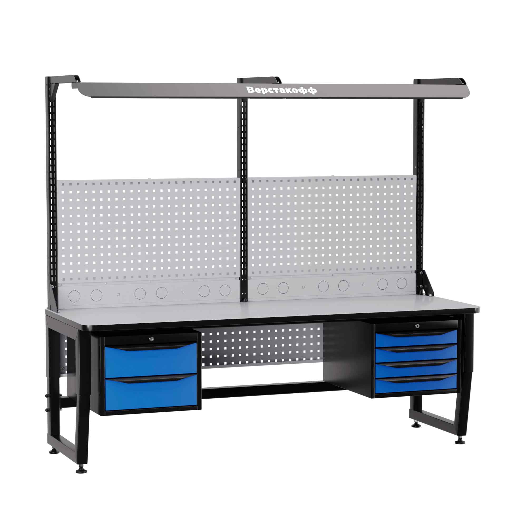 Для наилучшей освещенности при работе с мелкими электронными компонентами рабочее место комплектуется блоком освещения. В его составе - специальный промышленный светильник с необходимой цветовой температурой и световым потоком, обеспечивающим оптимальные условия работы. Блок освещения располагается над рабочей поверхностью на регулируемых (по высоте и по вылету) кронштейнах