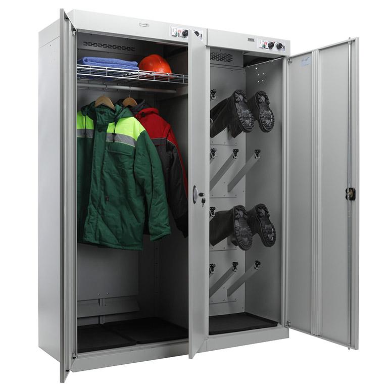 - шкаф состоит из двух независимых секций. Первая двухдверная для одежды, с перекладиной для вешалок и полкой. Вторая - для сушки обуви, оборудована патрубками для развешивания