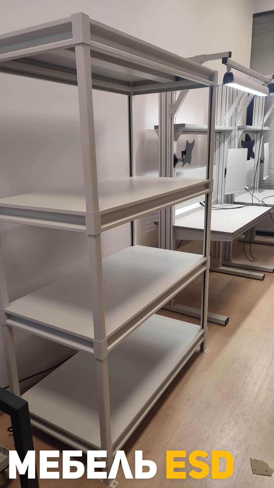 Стеллаж антистатический СУМ ESD окрашен полимерной антистатической порошковой краской, защищающей электронные компоненты от электростатического заряда. В антистатическом исполнении, согласно требованиям стандарта ГОСТ IEC 61340-5-1-2019, на лицевой стороне имеется маркировка
